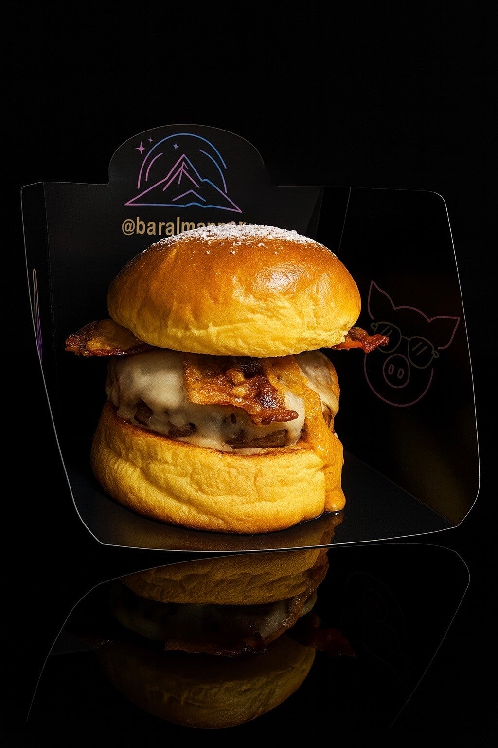 Pan artesanal potato bun, carne de chuletón de vaca madurada, queso cheddar, queso ahumado, mermelada de bacon con cebolla caramelizada, baconeras, crema camembert y salsa mágic